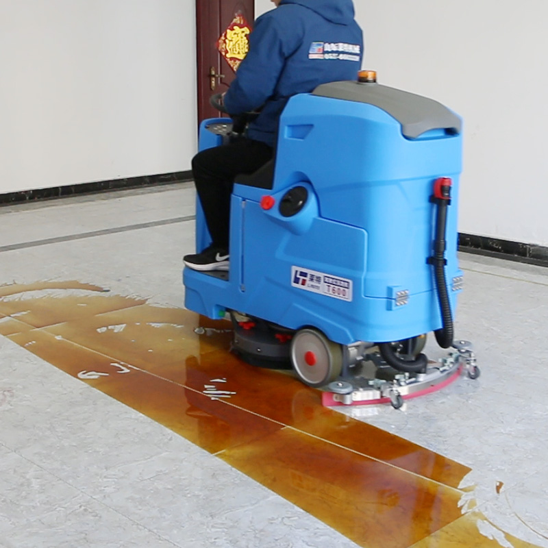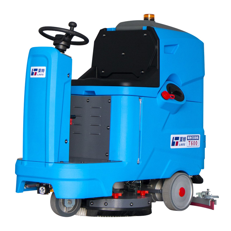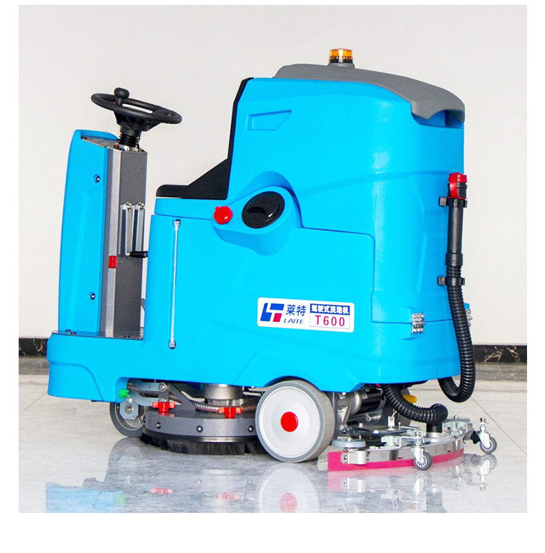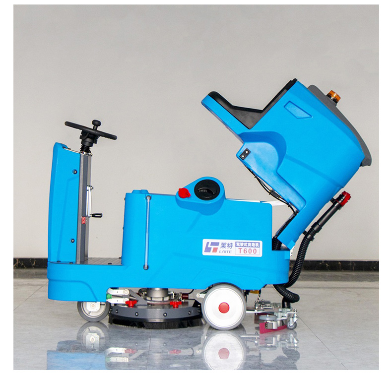 莱特工业洗地机T600型,机身尺寸:1370*800*1300mm,吸水扒宽度:1000mm,额定电压:DC24V,工作效率:3600m²/h,标配电池容量:100A,连续工作时间:3-4h,工作宽度:530mm,刷盘转速:150rpm,刷盘功率:550W,吸水功率:600W,行走功率:1000W,行走速度:0-7km/h,清水箱容量:90L,污水箱容量:100L,声级:60dB(A),整车重量:201kg。具备:全自动升高和降低刷盘、吸水扒;倒车自带吸水趴和刷盘升降功能;污水箱满了自动停机功能;配有水量显示器,可直观观察水位变化;电磁刹车装置,坡道上停车时不会溜车,更安全;采用双控制器系统控制整车电控,维修简单快捷;浮球滤网+传感器双重保护设计可防止污水进入真空电机;更轻便小巧,适用于较小的场所,可直接进出电梯,方便清洗不同楼层;两个注水口设计:大注水口可实现快速注水,小注水口适用于远距离注水;污水箱易清洗。静音设计,适用于对声音敏感的环境,如办公场所,医院;吸水扒易装卸,遇到障碍物时自动脱落,可保护吸水扒,帮助机器顺利通过。