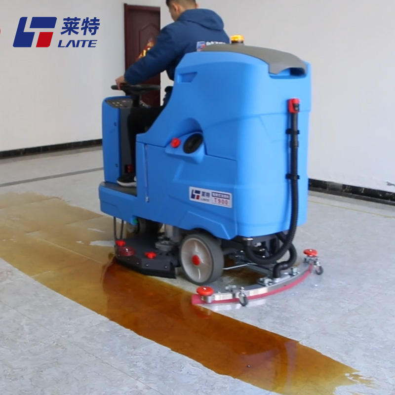 莱特工业洗地机T900型:机身尺寸:1600*1100*1420mm,吸水扒宽度:1200mm,工作效率:6800m²/h,工作宽度:900mm,刷盘转速:190rpm,刷盘功率:600W*2,吸水功率:600W,行走功率:1000W,行走速度:0-7km/h,最大爬坡率:≤25°,额定电压:DC24V,标配电池容量:200Ah锂电池,连续工作时间:5-6h,清水箱容量:175L,污水箱容量:180L,声级:60dB(A),转弯半径:500mm,整车重量:400kg。具备:全自动升高和降低刷盘、吸水扒;刷盘和吸水趴倒车自动升降,有效保护设备损伤;污水箱满了自动停机功能;配有高压清洗枪,可以清洗污水箱和吸水趴,方便快捷;按键式操作面板,简单易懂;双集成控制器,带故障自检功能;滤网可防止污水进入真空电机;配有水量显示器,可直观观察水位变化;大功率前驱电机,转弯灵活,操作便利;超静音设计,适用于对声音敏感的环境,如办公场所,疗养院,医院;吸水扒易装卸,遇到障碍物时自动脱落,可保护吸水扒,帮助机器顺利通过;两个注水口设计:大注水口可实现快速注水,小注水口配备3米长加水管适用于距离水源较远的场所;吸水扒易装卸,遇到障碍物时自动脱落,可保护吸水扒,帮助机器顺利通过。